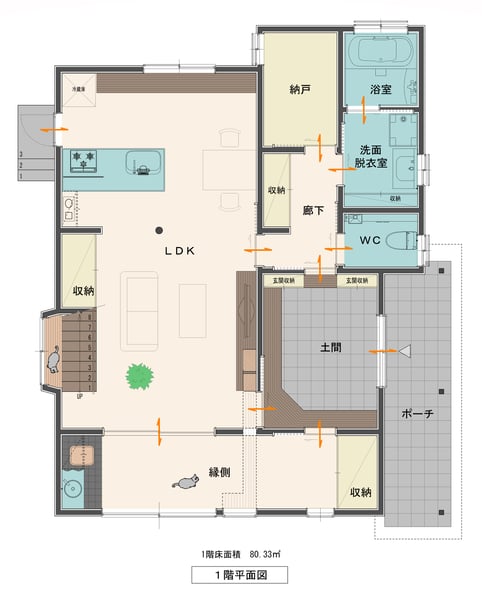 玄関からリビングを通らずにキッチンや水廻りへ行ける動線も使い勝手のいいところ。