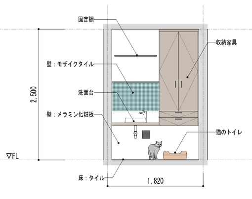 掃除のしやすさと汚れにくさを考慮して床はタイル仕上げ、壁はメラミン化粧板仕上げです。におい対策で換気扇も設置します。