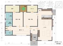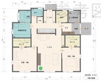 広いLDKと広い寝室、玄関横に洗面室があるプラン。